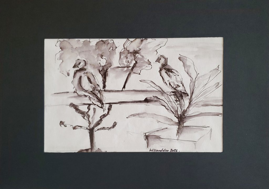 Un oiseau s’avance, l’autre observe : entre végétal domestiqué et instinct sauvage, la nature compose son propre équilibre.